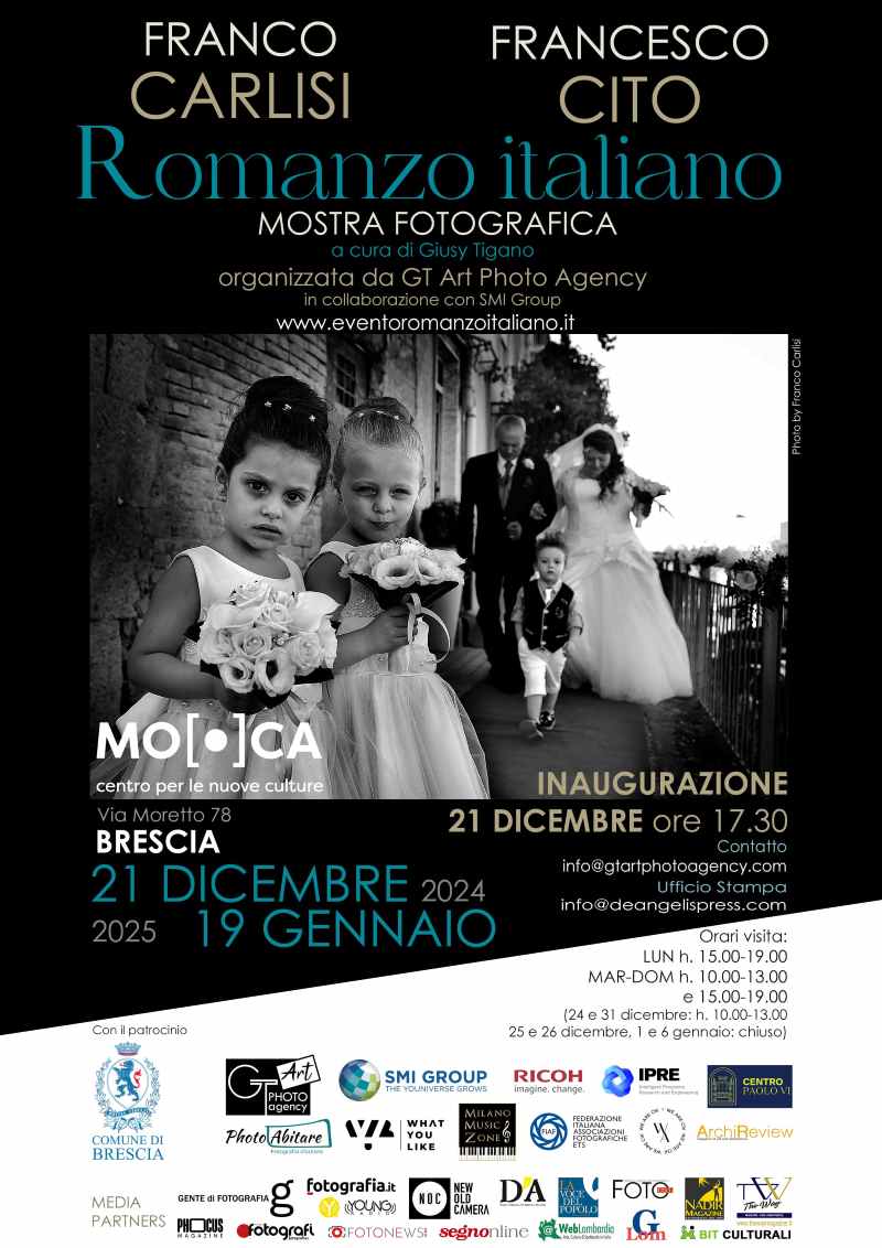 Si svolgerà dal 21 dicembre 2024 al 19 gennaio 2025 con il patrocinio del Comune di Brescia nello Spazio espositivo del MO.CA Centro per le nuove culture del Palazzo Martinengo Colleoni di Brescia la mostra “Romanzo italiano” con le opere fotografiche di Franco Carlisi e Francesco Cito.