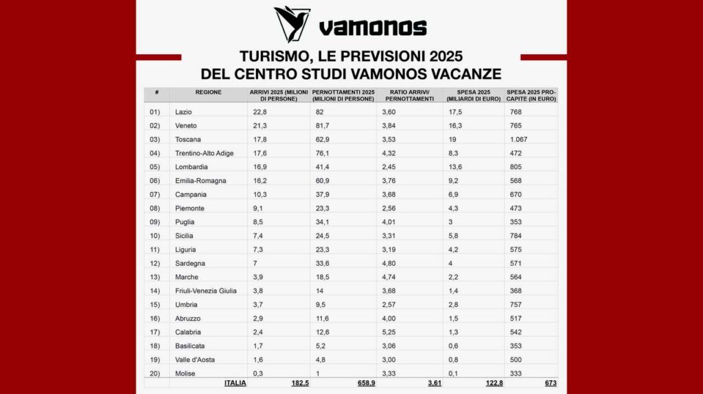 Tenuto conto dell’Anno Santo ed elaborando le serie storiche dei flussi turistici nel nostro Paese in base a dati Istat, Bankitalia e dati interni, Vamonos-Vacanze.it, la piattaforma specializzata in vacanze per single, ha stimato gli arrivi, le presenze e la spesa turistica del 2025 in Italia, regione per regione.